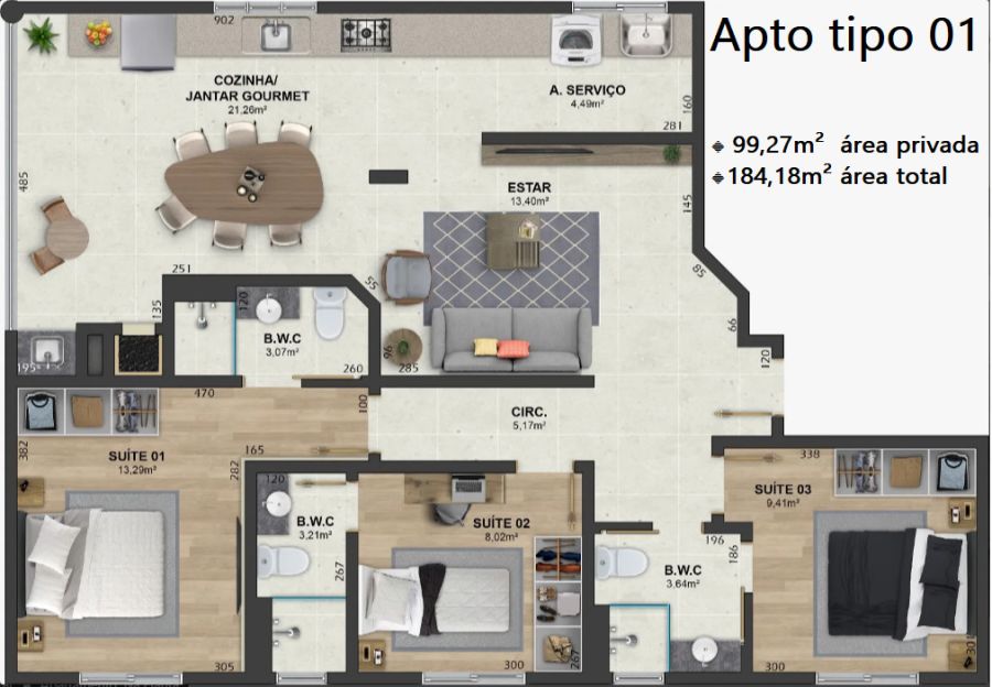 - Área Privativa: 99,27 m²