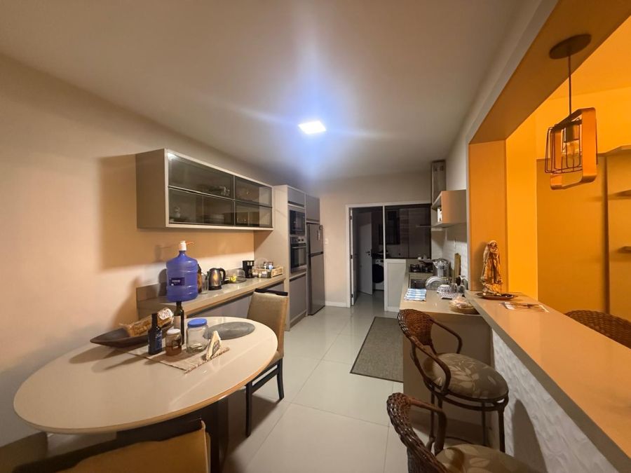 Ao entrar, percebe-se imediatamente a sensação de amplitude e a praticidade de um imóvel totalmente mobiliado, pronto para ser habitado. O projeto valoriza a convivência, apresentando uma cozinha americana que se integra de forma fluida aos demais ambientes, permitindo que o preparo das refeições se torne um momento de interação. A presença de uma churrasqueira privativa reforça o convite para momentos de lazer e celebração em família, sem abrir mão da privacidade.